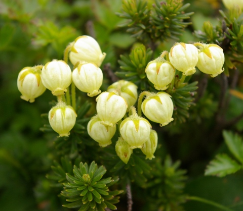 | 草丈:10−30cmの常緑の小低木。 茎: 葉:葉は縁が外側に巻きこむ。 花:5−10個まとまって下向きに付く。花柄には腺毛がある。 果実: |