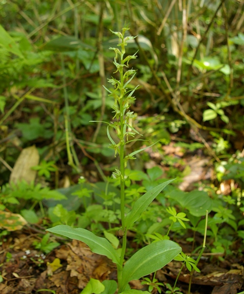 | ラン科の中では目立たない花である。野幌森林公園ではサルメンエビネと同じ時期に咲いている。木陰に生育するので良い写真が撮れない。どうしても緑がかってしまう。 |