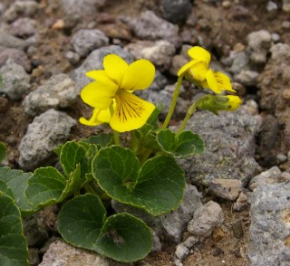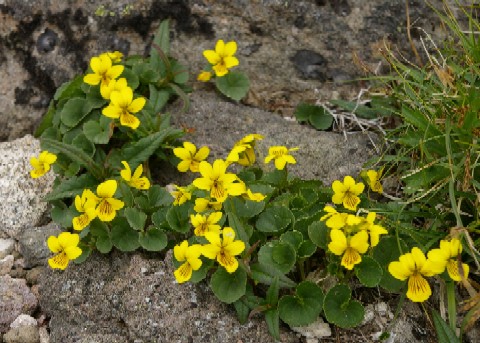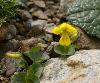 | これも北海道で初めて見たスミレ。キバナノコマノツメに近い。頂上近くの砂礫地や風衝地に咲く。近くで良く見ると岩の間にしっかりと根を下ろしている。なんと生命力が強いのだろうか。夕張山のエゾタカネスミレの葉はやや紫色かかる。08年八ヶ岳でヤツガタケキスミレをみた。同じような環境で生育するが葉は光沢がなく有毛。 |