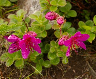 | 丸い蕾が可愛らしくまた、株の割には大きな花をつけるので良く目立つ。 最初に見たのは礼文島のハイジの丘。草本だと思ったくらい小さな株が風に揺れていたが、富良野岳で見たのは花柄が大きく伸び、つつじらしい姿だった。 |