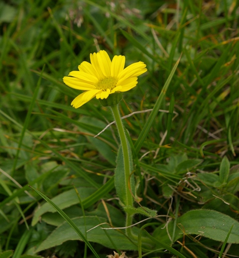 | 草丈:15−40cm 茎:直立。分枝しない。 葉:下部の葉はさじ状で長さ6−12mm。多少毛がある。対生。 黄色い花を茎頂に1個付ける。花冠(花弁)は無毛 果実: |