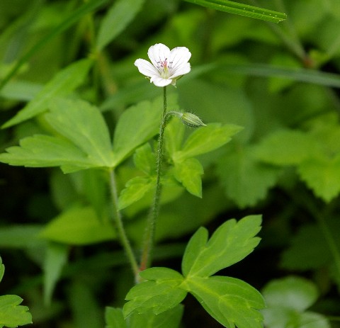 | 草丈:30−70cm、 茎や葉柄に下向きの毛がある。小花柄とがくには短毛と開出腺毛がある。 葉:3−5個に掌状に深く切れこむ。裂片も更に浅く3列し、先は鈍頭。 果実: |