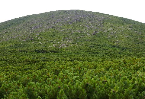 | 撮影地:北海道緑岳(2005.8.7) Pentax *istDS このハイマツ帯を抜けナキウサギのいる岩場を登りきると緑岳の頂上である。 |
