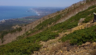 | アポイ岳幌満お花畑から様似方面(2006.5.21) Pentax *istDS 遠く見えるのは太平洋です。 このハイマツ帯付近にはかつてヒダカソウの群落がたくさんあった。 |