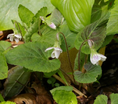 | 名前の通り日陰で咲くスミレ。軟毛が多い。5月の連休に函館山を登ったがこのヒカゲスミレ、スミレサイシン、ニオイタチツボスミレ、ヒナスミレほかスミレが競演していた。関東では葉の表面が薄黒くなりタカオスミレ(またはハグロスミレ)と呼ばれるものがある。ここ函館山でも少し黒くなっているのも見られる。 |