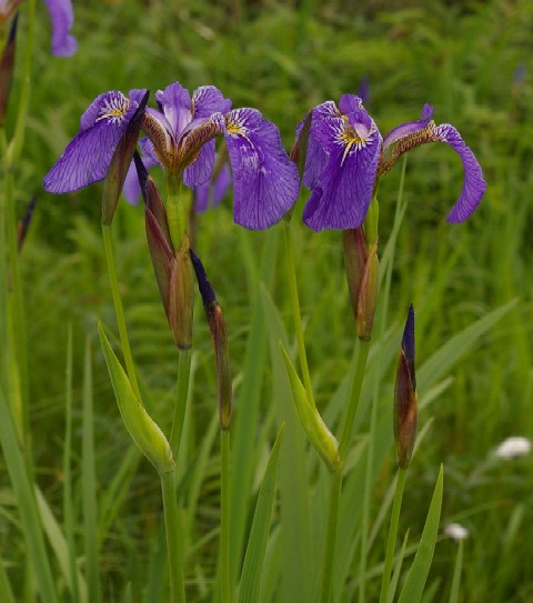 花の時期:6−8月 花の色:青紫色、基部は黄色。 紫のアヤメがある |