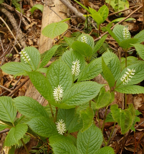 | ヒトリシズカ、良い名前だ。何か美人に逢ったような気がする。開き始めた葉の中の花は被写体としては最高だ(が良い写真を撮るのは難しい)。同じ仲間で二人静(花穂が2本)もある。三人静かもあるらしい?(本当かどうかは不明) |