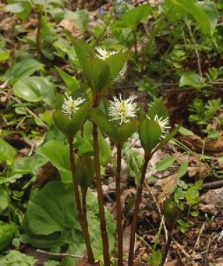 | 草丈:20−30cm。 茎:分枝しない。 葉:葉は通常4枚、茎の先に輪状に相接し対生する。葉身は光沢があり、長さ5−12cm。 花:茎頂に1個の花穂を出し花糸は3本細長く開出する。 果実: |