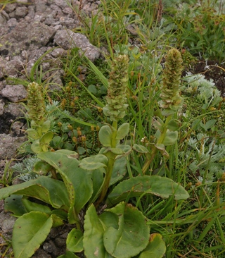 | 背丈:10−15cm 葉:根出葉は狭卵形〜長楕円形、鈍鋸歯縁、茎葉は卵形〜広卵形、光沢がある。 果実: |
