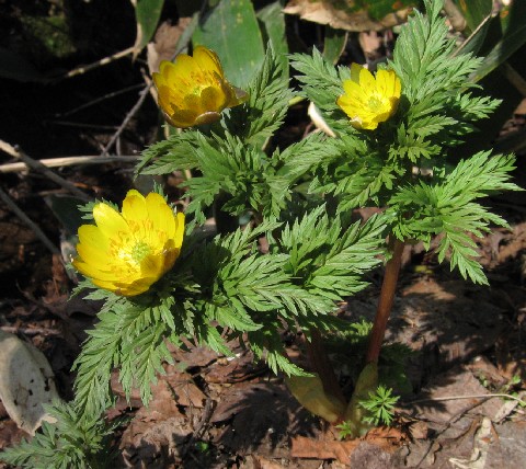 | 福寿草は正月に出回る盆栽、梅園の梅の木の下に植えてあるものを良く見たが、北海道では野生のものが見られあまり珍しくも無いようだ。咲き始めの花は光沢がありしっかりしているが少し大きくなるとまとまりが無くなってくる。 |