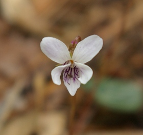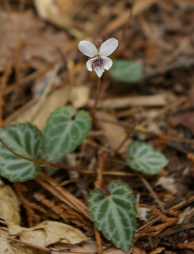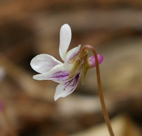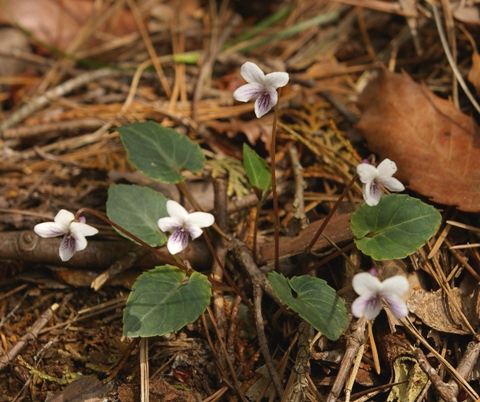 | 関東育ちの筆者にはフモトスミレは普通に見られるスミレだった。小さい花ながらも非常に可愛いらしいスミレだ。大型のサクラスミレも美しいが、フモトスミレは小さなスミレでは一番可愛い。葉の形・色は変化が多い。斑入りのものはフイリフモトスミレという。この種は北海道には生育しない。 |