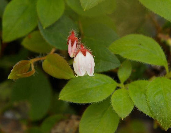 | 草丈:常緑の低小木、10−30cm 茎:茎は細く良く分枝する。若い枝や花柄に赤褐色の毛がある。 葉:広卵形で1.5−3cm。革質硬く脈ははっきりしている。縁に波状の細鋸歯がある。 花:枝先に数個付く。斜下を向いて咲く。花冠は長さ1cmほどの釣鐘状で先は浅く5裂する。 果実:球形で赤く熟す。食べられる。 |