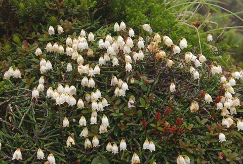 | 草丈:5cm。常緑の小低木 茎: 葉:髭状の長く鱗状の葉が特徴。葉は4角い。 花:釣鐘状の小さな花が下向きに咲く。 果実: |