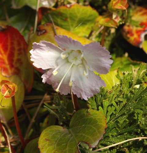 | 06年4月東京に出張した後、栃木まで寄り道をしてきた。イワカガミとイワウチワの写真を撮ってきた。イワカガミよりやや大きめの葉と花で、花は1個付ける。イワウチワの方が花期が早い。イワカガミが満開だったのにイワウチワは1個しか花を付けていなかった。 |