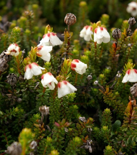 | 草丈:高さ5cmくらいの常緑の小低木 茎:長く地面を這って枝分かれが多い。 葉:2mmほどの葉がびっしりついている 花:花は広い口の釣鐘状。がく片は紅色である 果実: |