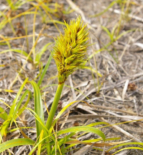 | 草丈:10−20cm 茎:太い根茎が横に伸びる。 葉:根生して硬い。長さ10−30cm。基部は褐色の鞘となる。 花序は雌雄異株、雌花には黄色い鱗片がある。 果実:熟した果胞は上を向く |