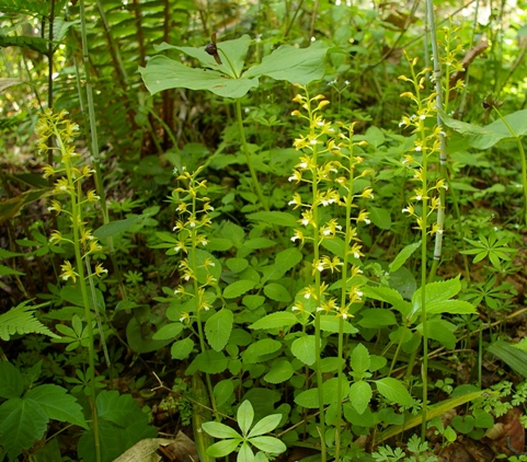 | 草丈:30−50cm 茎:直立する。やや細く曲がりやすい。 葉:披心形−狭長楕円形で先は鋭角。葉は1−2枚付く。無毛。 花:長さ10−20cmの総状花序を密に付ける。花は斜めに咲き、萼片、花弁は披心形で長さ1cm、やや鈍頭、鋭頭。 果実: |