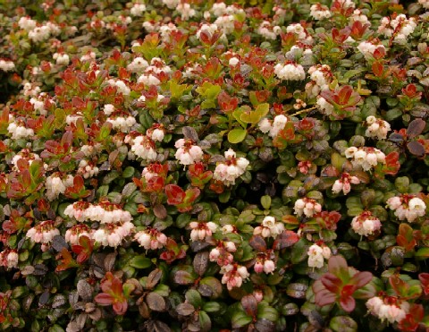 | 草丈:高さ5−15cmの常緑低小木 茎: 葉:葉は楕円形、1cm位。小群落を作る 花:数個まとまって付き、釣鐘形で先が4つに浅裂する 果実:実は赤く熟す |