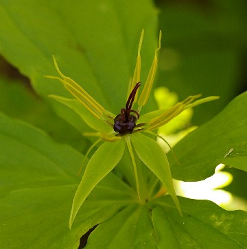 | 草丈:50−90cm 茎: 無毛 葉:4−8個輪生し、倒披心形から狭倒卵形。先は短く鋭尖形。両面無毛。 花:茎に1花付く。花柄は3.5−15cm。外花被片は緑色、内花被片は糸状。 果実:黒紫色で球形。 |