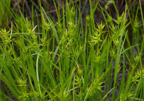 | 草丈:20−40cm 茎:細く2−3葉を付ける。 葉:巾3−5mm。 茎の先に雄性の花穂を1個、その下に雌性の花穂を2−4個付ける。 果実:果胞は放射状に付き良く目立つ |