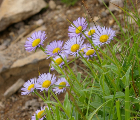 | 草原でも見られるし岩地でも見られる。花が大きいので良く目立つ。アポイアズマギクはこの種の変種である。 |