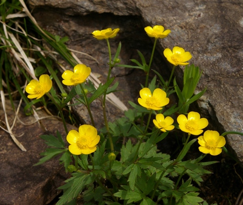 | 高山植物の代表選手。黄色はミヤマキンポウゲとチシマノキンバイソウ、白いのはエゾノハクサンイチゲ。外側の花びらに見えるのはがく片で、内側に花弁が同じく5枚ある。 本州の野原にはウマノアシガタが生育している。ミヤマキンポウゲの方が葉身が狭く、根出葉の柄や茎の毛は寝る。 |