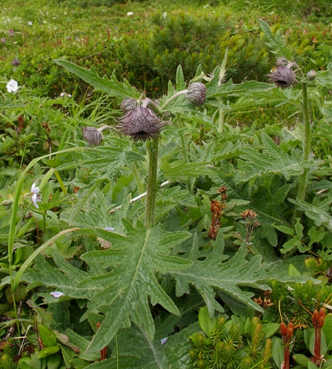 | 大雪山の固有種。エゾノサワアザミの高山形で葉の裂片の巾が少し広い。 |