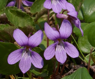 | ミヤマスミレ類の仲間はスミレの中では一番多く20種類あり、雑種も多く、分類も中々難しい。葉の形、植物体の毛の有無、花弁内側の毛の有無、花の色、根の色等を判断基準としているが個体差も大きく簡単には行かない。この写真館でも間違った分類もあるかも知れない。 このミヤマスミレも個体差が大きく、縁の切れ込みが大きいもの小さいもの、葉の表面の毛が多いもの少ないものあり同じ種類かと思う。葉に白い斑が有るものをフイリミヤマスミレという。北海道に多い。 |