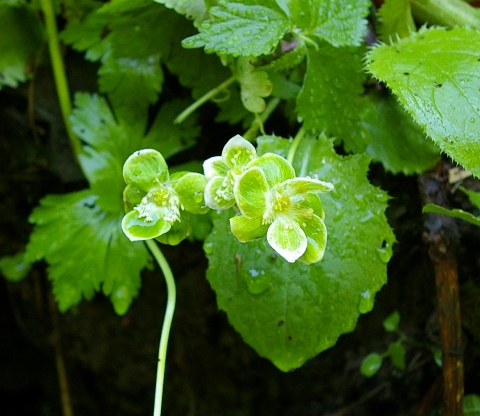 | 春を飾る花の一つ。東京では大きな群落はもう見られなかったが北海道では近くの林でも見られ大きな群落も沢山見かける。一輪草、二輪草、三輪草となるのだが、北海道では二輪草、三輪草しか見られない。 花弁(がく片)が緑のミドリニリンソウがある(下写真) |