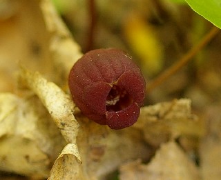 | 細辛は葉茎が辛いことによるが食べたことはない。写真が難しい花だ。暗い所に咲くし、花は這っているし。花はユーモラス。 |
