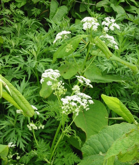 | 草丈:100−150cm。 茎:大きいが細くて軟弱な感じがする。上部は分枝する。 葉:2−3回羽状に分かれ深い鋸歯がある。下面脈上に剛毛がある。 花序は分枝した先に傘状に付き、周辺外側の花が大きい。 果実:長さ6−8mm。 |