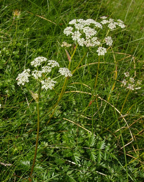 | 白い花で目立たないが草地では良く見られる。葉が人参の葉に似ている。セリ科の花は近くに行かないとなかなか区別がつかない。(眼も悪いし。) |