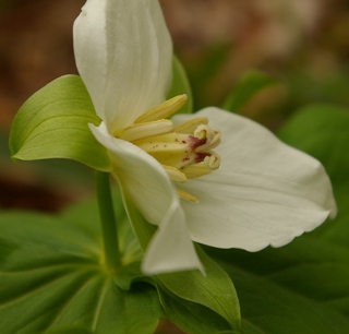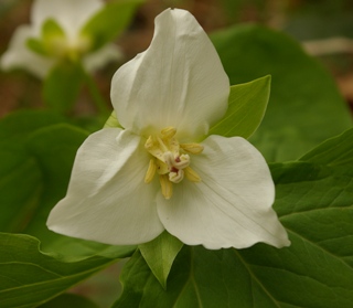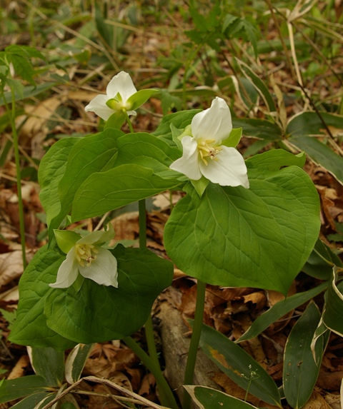 | 北海道白老地方で見つけられた。オオバナノエンレイソウとミヤマエンレイソウの雑種。 ポロト湖の散策路を2時間ほど探したが、多分この写真がシラオイエンレイソウだと思う。もし間違っていたらご指摘を賜りたい。散策路の周りにはオオバナノエンレイソウとミヤマエンレイソウが沢山咲いており、大株のオオバナノエンレイソウが全てシラオイエンレイソウに見えてくる。ここのオオバナノエンレイソウの葯は全体的に短いのではなかろうか? |