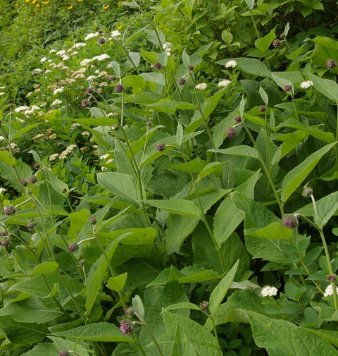 | チシマアザミの葉は変化が多く、全縁のものから羽状に中裂するものまである。この写真は黒岳登山道のものだが、ナガバキタアザミとほとんど同じ場所に咲いているもの。 |