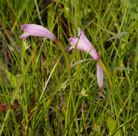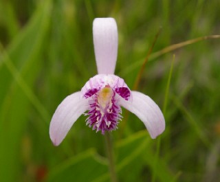 | 花の色が鳥の朱鷺色に似ているので「トキソウ」の名が付いた。学名は「Pogonia japonica」と言い、トキと同じくjaponicaの名が付いている。小型で美しい花だ。 野生の「トキソウ」を最初に見たのは30年以上も前の尾瀬ケ原であった。北海道では雨竜沼湿原で見ることができたが雨竜沼では少数しか見られない。木道から外れて写真を撮る人がいるらしく道が出来ていた。止めて欲しいものだ。浮島湿原では木道の近くから沢山見られる。バスツアーの観光客が多いのがねー。 |