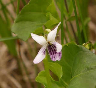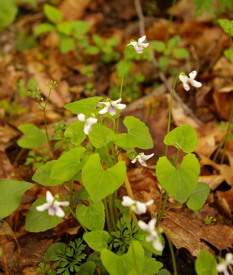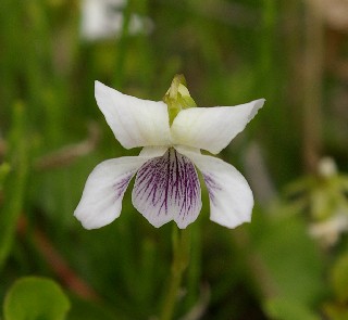 花の時期:4−6月(スミレの中では遅い方 花の色:白、唇弁に紫条。 |