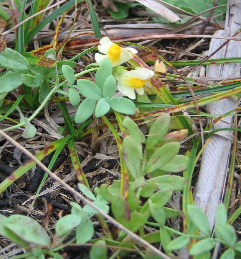 | 草丈:15−30cm 茎:地上を這って斜上する。 葉:厚く3−4枚輪生する。(互生、対生もある)脈が目立つ 花:茎の先に数個付く。がくは5裂し、花冠は仮面状で細長い距がある、下唇の中央部は盛り上がり黄色くなる。 果実: |