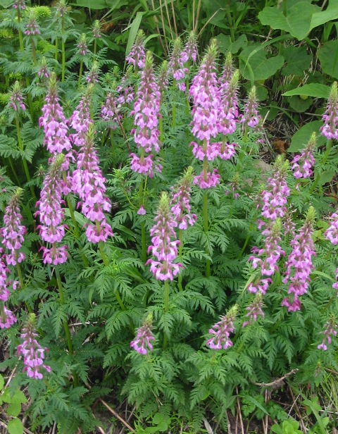 | 群生すると見ごたえがある。茎葉は4枚輪生、2−5段になるのが普通だが、3−6枚の輪生もある。高山帯では風の関係で草丈も小さいが、礼文島に生育するものは全体大きく「レブンシオガマ」ともいう。法面にもパイオニア的にも進出している。 |