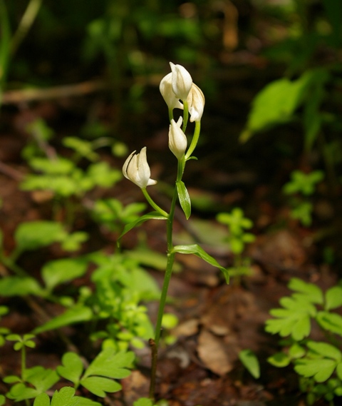 | 草丈:15−20cm 茎:直立する。無毛。 葉:葉は退化し小さい1−2枚のほかは鞘状になる。 花:茎頂に数個つく。唇弁の距は長く3-4mmくらいある。 果実:黒い |